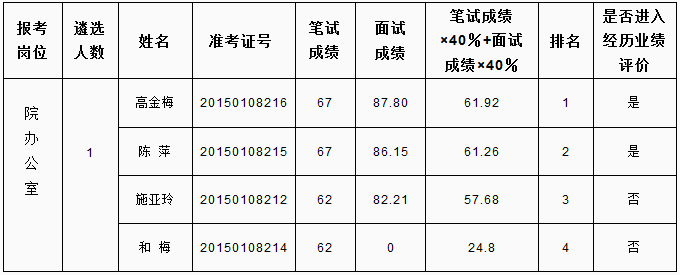 根據(jù)《怒江州2015年州級機關(guān)公開遴選公務員和參照公務員法管理單位工作人員公告》要求,面試由遴選單位負責實施,現(xiàn)將怒江州人民檢察院公開遴選公務員面試成績及進入業(yè)績評價人員名單公告如下: