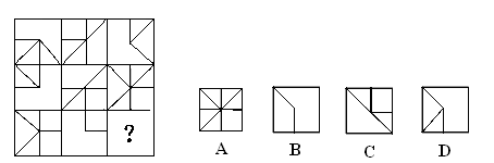 (解答:每行前兩個圖形疊加后,不同的部分就是第三個圖形。正確答案是D。)