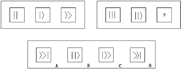 例題:下題給出兩套圖形,左套中的三個圖形在構(gòu)成或變化上,具有某種特點或遵循某種規(guī)則。要求從下面四個選項中,選擇一個取代右套中的“?”,使右套圖形也具有與左套圖形相同或相似的構(gòu)成特點或變化規(guī)則。