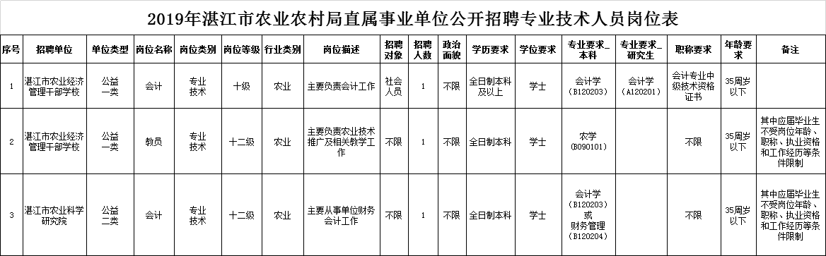 招聘單位、崗位、名額、條件、專業(yè)要求等詳見(jiàn)《2019年湛江市農(nóng)業(yè)農(nóng)村局直屬事業(yè)單位公開(kāi)招聘專業(yè)技術(shù)人員崗位表》(附件1)