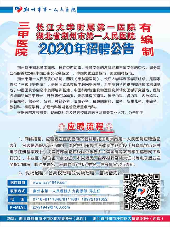 2020年荊州市第一人民醫(yī)院招聘公告已公布,湖北衛(wèi)生人才網(wǎng)特別整理了公告相關(guān)信息,以下是公告詳情: