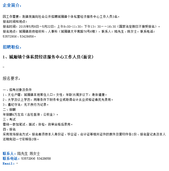 2015年江蘇省太倉市城廂鎮(zhèn)人民政府個(gè)體私營經(jīng)濟(jì)服務(wù)中心招聘公告【招3人】