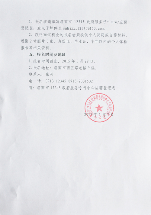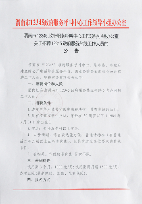 2015年陜西省渭南市12345政府服務熱線人員招聘5人公告【招5人】