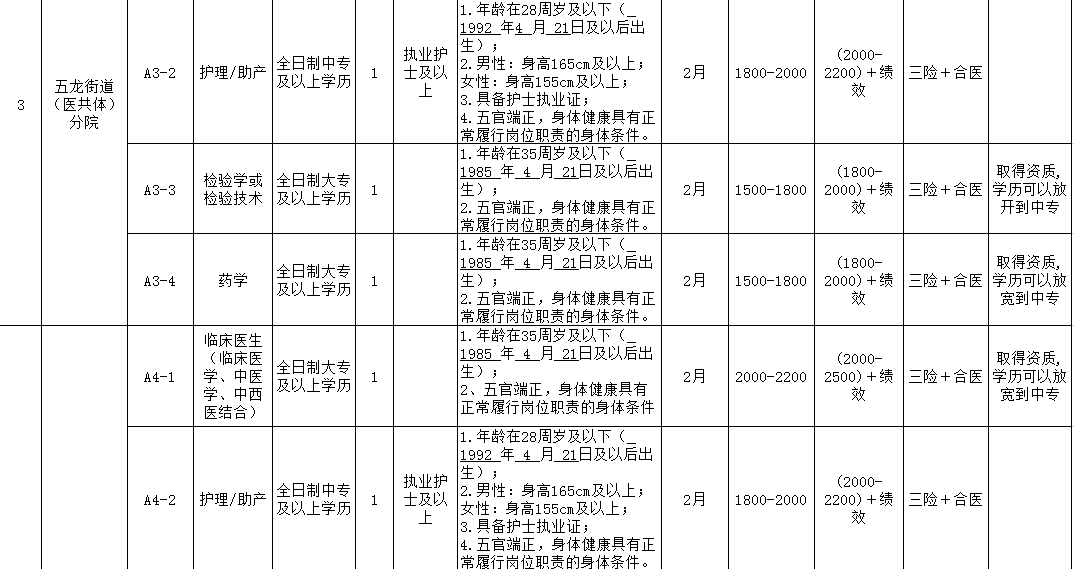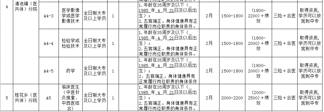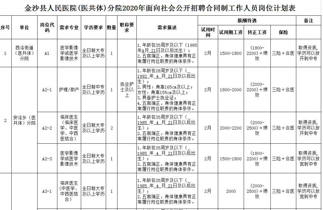 三、待遇:按照《金沙縣人民醫(yī)院(醫(yī)共體)分院關(guān)于聘用人員工資通知》執(zhí)行,繳納三險(養(yǎng)老保險、工傷保險、失業(yè)保險)及合醫(yī)。
