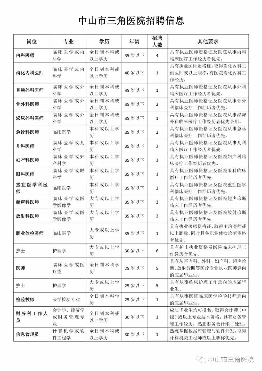 為適應(yīng)中山市三角醫(yī)院的快速發(fā)展,更好地服務(wù)于群眾,現(xiàn)面向社會(huì)招聘以下崗位工作人員。