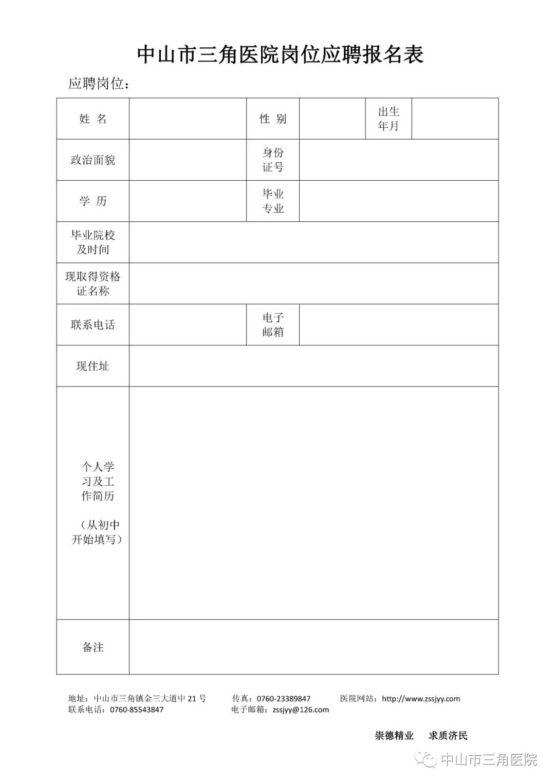 包括居民身份證、畢業(yè)證、從業(yè)資格證等掃描件,個(gè)人簡(jiǎn)歷1份,并填寫《中山市三角醫(yī)院崗位應(yīng)聘報(bào)名表》發(fā)送到中山市三角醫(yī)院電子郵箱zssjyy@126.com。