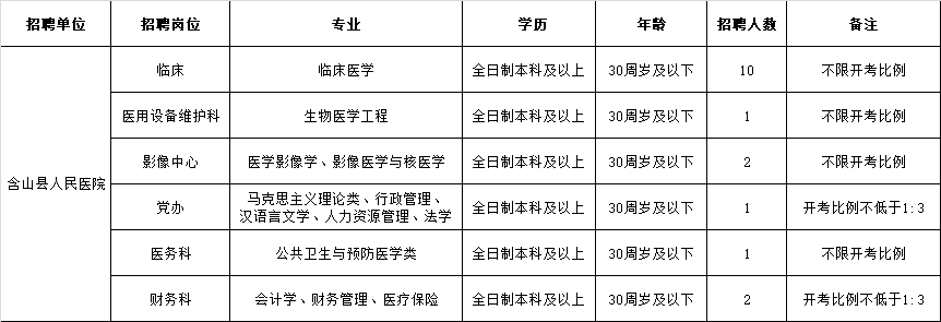 一、招聘計劃:臨床醫(yī)學10名、醫(yī)學影像學2名、財務2名、黨辦1名、公共衛(wèi)生與預防醫(yī)學1名、生物醫(yī)學工程1名,各崗位具體要求及說明詳見《含山縣人民醫(yī)院2020年公開招聘部分崗位工作人員職位表》。