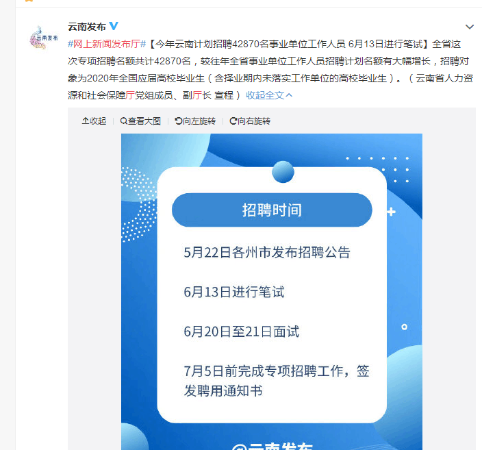 2020云南事業(yè)單位招聘考試有消息了,近日在中共云南省委宣傳部官方微博發(fā)布了一條關于2020云南事業(yè)單位招聘考試的消息,里面明確提到今年云南計劃招聘42870名事業(yè)單位工作人員 6月13日進行筆試,全省這次專項招聘名額共計42870名,較往年全省事業(yè)單位工作人員招聘計劃名額有大幅增長,招聘對象為2020年全國應屆高校畢業(yè)生(含擇業(yè)期內未落實工作單位的高校畢業(yè)生)。以下是官方發(fā)布信息的截圖。