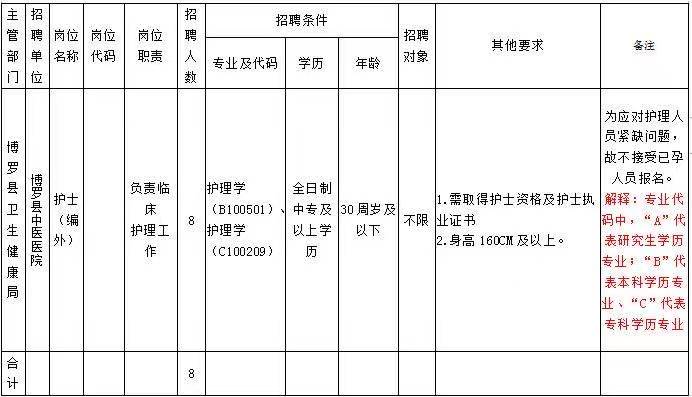 根據(jù)《廣東省事業(yè)單位公開招聘人員辦法》(粵府令第139號)、《博羅縣進(jìn)一步深化基層醫(yī)療衛(wèi)生機(jī)構(gòu)綜合改革工作方案》(博衛(wèi)〔2018〕58號)和《博羅縣衛(wèi)生人才發(fā)展三年攻堅規(guī)劃實施方案》(博衛(wèi)〔2018〕68號)文件精神,現(xiàn)面向社會公開招聘8名編外護(hù)理人員,具體公告如下: