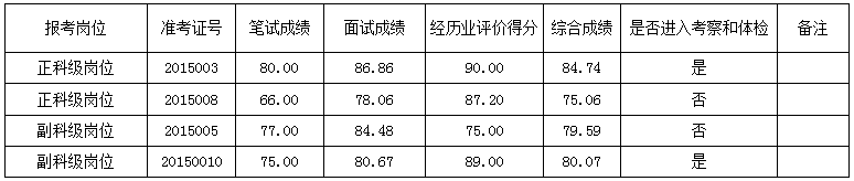 根據(jù)《曲靖市紅十字會2015年公開遴選公務(wù)員實施方案》的規(guī)定,綜合成績構(gòu)成為筆試成績占40%,面試成績占40%,經(jīng)歷業(yè)績評價占20%,現(xiàn)將曲靖市紅十字會2015年公開遴選公務(wù)員進入經(jīng)歷業(yè)績評價人員的筆試、面試、經(jīng)歷業(yè)績評價、綜合成績及進入考察和體檢人員公告如下: