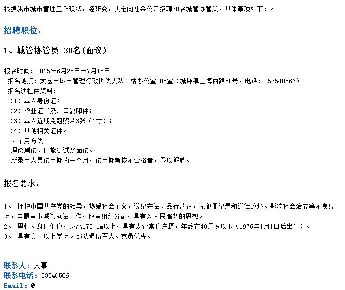 2015江蘇太倉(cāng)市城市管理行政執(zhí)法大隊(duì)招聘城管協(xié)管員公告【招30人】
