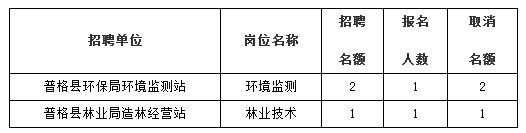 按照《中共普格縣委組織部普格縣人力資源和社會局關(guān)于2015年公開招聘事業(yè)單位工作人員的公告》規(guī)定,根據(jù)報名情況,經(jīng)研究決定取消報名人數(shù)未達到1:3開考比例的2個招考崗位(招聘名額3名),現(xiàn)公告如下: