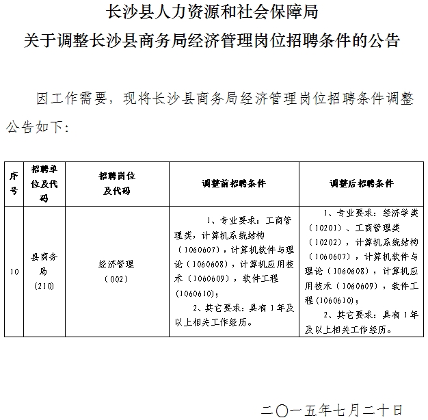 2015湖南長沙縣商務(wù)局經(jīng)濟(jì)管理崗位招聘條件調(diào)整公告