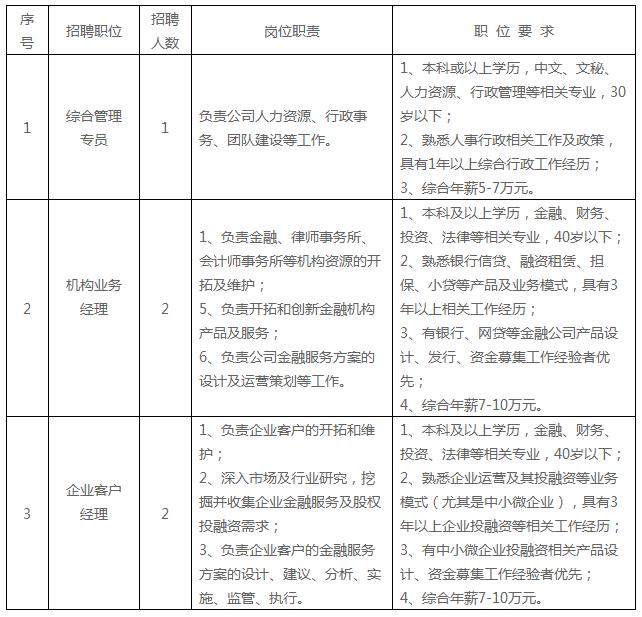 公司秉承簡潔務(wù)實(shí)、無我有為、創(chuàng)新高效的園區(qū)精神,力求促進(jìn)園區(qū)經(jīng)濟(jì)社會協(xié)調(diào)發(fā)展。為進(jìn)一步推進(jìn)金融服務(wù)中心的工作穩(wěn)步有序開展,公司將搭建互聯(lián)網(wǎng)平臺,多渠道、多層次的引導(dǎo)更多的社會資本投入到經(jīng)濟(jì)開發(fā)區(qū)的企業(yè)中,促進(jìn)銀企合作,開拓眾籌、P2P等新業(yè)務(wù)模式,公司決定公開招聘工作人員5名。具體如下: