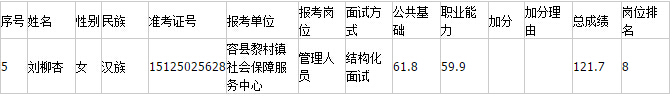 《2015年容縣事業(yè)單位公開招聘工作人員考試進(jìn)入面試資格復(fù)審人員的公告》中容縣黎村鎮(zhèn)社會服務(wù)中心管理人員招聘人數(shù)2人,從到低分按1:3的比例,比例內(nèi)末位2名考生筆試總成績并列第六名,同時(shí)確定為進(jìn)入面試范圍人選,總共有7名考生進(jìn)入該崗位面試資格復(fù)審。在面試資格復(fù)審時(shí)其中一名考生放棄了面試機(jī)會,比例內(nèi)進(jìn)入面試范圍人選為6名考生,按1:3比例不能進(jìn)行遞補(bǔ)。因此,取消《2015年容縣事業(yè)單位公開招聘工作人員考試遞補(bǔ)進(jìn)入面試資格復(fù)審人員的公告》中劉柳杏同志遞補(bǔ)進(jìn)入面試資格復(fù)審人員資格,具體名單如下表: