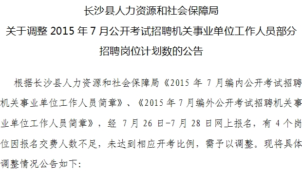 2015年7月湖南長沙考試機關事業(yè)單位調(diào)整招聘崗位計劃數(shù)公告