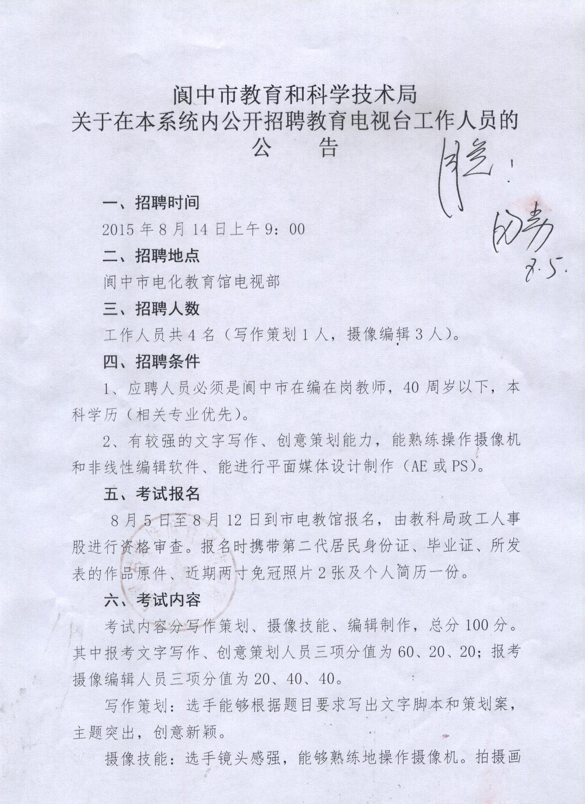 2015四川閬中市教育和科學(xué)技術(shù)局本系統(tǒng)內(nèi)招聘教育電視臺人員公告【招4人】
