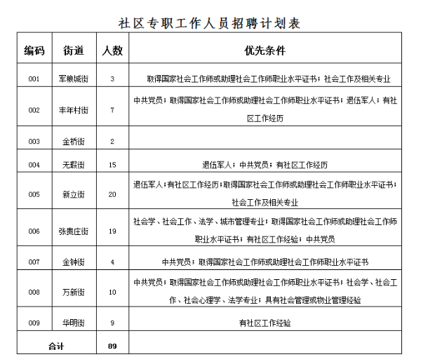 面向社會(huì)招聘社區(qū)專職工作人員89人,具體招聘計(jì)劃見(jiàn)下表: