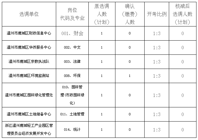 2015年下半年溫州市鹿城區(qū)事業(yè)單位公開(kāi)選調(diào)工作人員繳費(fèi)確認(rèn)工作已結(jié)束,共有7個(gè)崗位繳費(fèi)確認(rèn)人數(shù)達(dá)不到規(guī)定的比例。根據(jù)《2015年下半年溫州市鹿城區(qū)事業(yè)單位公開(kāi)選調(diào)工作人員公告》要求,經(jīng)研究決定,核減下列公開(kāi)選調(diào)計(jì)劃。