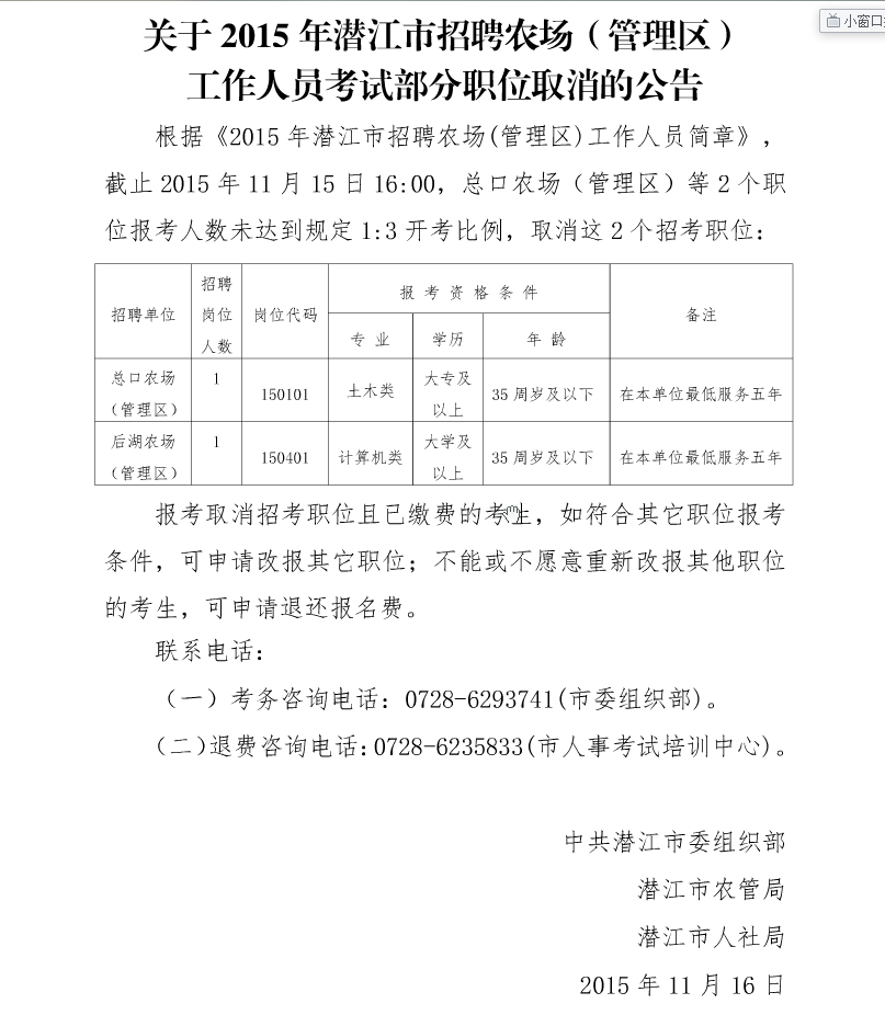 原標(biāo)題:關(guān)于2015年潛江市招聘農(nóng)場(管理區(qū))工作人員考試部分職位取消的公告