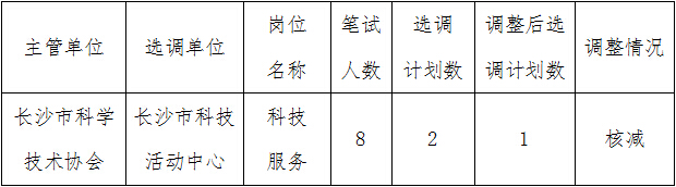 2015年長沙市科技活動中心公開選調(diào)工作人員經(jīng)報名、資格初審等程序,共有1個崗位未達到《選調(diào)公告》規(guī)定的開考比例,根據(jù)《選調(diào)公告》的相關(guān)規(guī)定,核減科技服務崗位選調(diào)計劃1名,具體情況下: