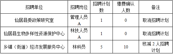 根據(jù)《2015年下半年仙居縣事業(yè)單位公開招聘工作人員公告》精神,繳費(fèi)確認(rèn)人數(shù)不足招聘計(jì)劃數(shù)3倍的崗位,相應(yīng)核減該崗位招聘計(jì)劃人數(shù)(其中擬招聘計(jì)劃人數(shù)為1名的,則取消該崗位招聘計(jì)劃)。現(xiàn)將取消或核減招聘崗位公示如下: