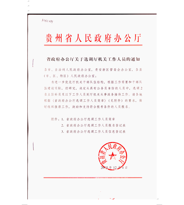 2015貴州省人民政府選調(diào)廳機(jī)關(guān)工作人員2名公告
