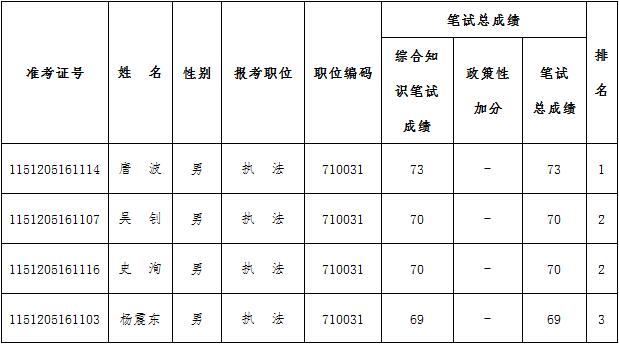根據(jù)考生的筆試折合總成績(jī),按各職位遴選名額的2倍,從到低分依次確定進(jìn)入面試人員。筆試成績(jī)相同的,一并進(jìn)入面試。進(jìn)入面試人數(shù)達(dá)不到遴選名額2倍的職位,該職位符合條件的筆試人員可全部進(jìn)入面試。面試人員名單如下: