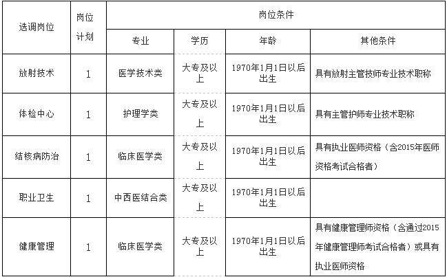 (一)選調(diào)崗位:共5名,詳見縣疾病預(yù)防控制中心2016年選調(diào)工作人員崗位計(jì)劃表;