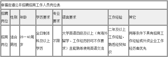 3. 具有應聘崗位所需的管理能力和專業(yè)技術能力以及其它資格條件。(具體見《幸福街道公開招聘招商工作人員崗位表》)