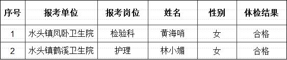 根據(jù)《2015年平陽縣醫(yī)療衛(wèi)生單位公開招聘工作人員公告》(平衛(wèi)發(fā)〔2015〕105號)文件規(guī)定,現(xiàn)將平陽縣醫(yī)療衛(wèi)生事業(yè)單位公開招聘工作人員補檢(當(dāng)時處于妊娠期,胸透項目未檢)結(jié)果予以公布如下: