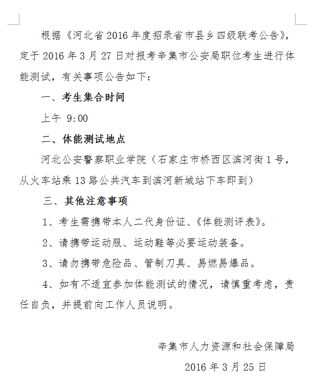 2016河北省市縣鄉(xiāng)四級(jí)聯(lián)考報(bào)考辛集市公安局職位考生體能測評(píng)安排