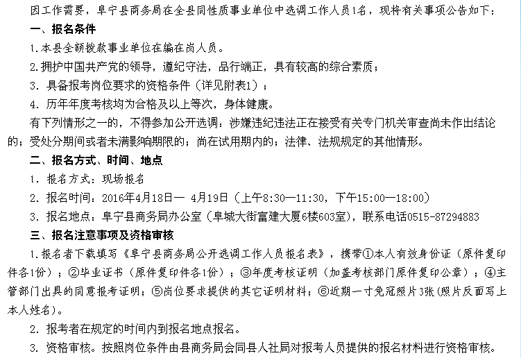 2016江蘇阜寧縣商務(wù)局選調(diào)1人公告