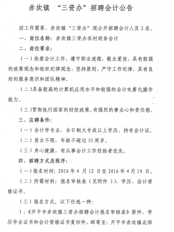 2016廣東開平市赤坎鎮(zhèn)“三資辦”招聘會(huì)計(jì)公告