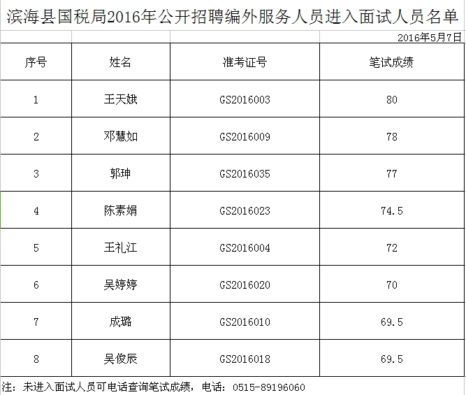 根據(jù)《濱??h國(guó)稅局2016年公開招聘編外服務(wù)人員公告》,經(jīng)過(guò)筆試,現(xiàn)將進(jìn)入面試人員名單予以公示(見附表)。面試時(shí)間為2016年5月8日(星期日)下午,地點(diǎn)為濱??h人才服務(wù)中心(縣城人民中路170號(hào))。請(qǐng)參加面試人員攜帶身份證、筆試準(zhǔn)考證于5月8日下午2:00前到達(dá)指定地點(diǎn)集中,遲到15分鐘者視為自動(dòng)放棄面試資格。