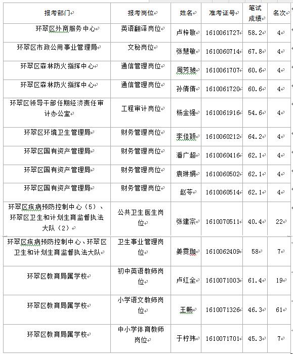 根據(jù)《關(guān)于確定2016年威海市環(huán)翠區(qū)屬事業(yè)單位公開招聘筆試合格分數(shù)線和面試資格審查有關(guān)問題的通知》規(guī)定,面試人選因資格審查不合格、棄權(quán)或遞補棄權(quán)造成職位上的人員空缺,由招錄機關(guān)按筆試成績依次遞補。現(xiàn)將遞補名單予以公布。請下列考生于6月12日下午4點之前提交資格審查材料,具體要求見《關(guān)于確定2016年威海市環(huán)翠區(qū)屬事業(yè)單位公開招聘筆試合格分數(shù)線和面試資格審查有關(guān)問題的通知》。