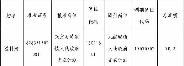 根據(jù)《2016年四川省高校畢業(yè)生“三支一扶”計劃招募公告》的規(guī)定,對有人參加筆試,無人參加面試的崗位,縣人力資源社會部門可在本縣報考同一項目中參加面試且同意調(diào)劑的考生中從到低分進行調(diào)劑招募。報考我縣九絲城鎮(zhèn)人民政府支農(nóng)計劃(崗位代碼:15070502)一考生主動放棄面試資格出現(xiàn)缺額,經(jīng)研究,決定調(diào)劑,現(xiàn)就調(diào)劑相關事項公告如下: