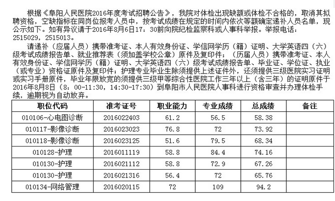 請(qǐng)入圍遞補(bǔ)人員帶身份證、準(zhǔn)考證于8月2日到縣人社局報(bào)到進(jìn)行資格確認(rèn),領(lǐng)取體檢通知書(shū),8月3日參加體檢。