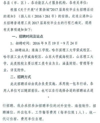 2017江蘇揚(yáng)州赴連云港和山東招聘普通理工類高校畢業(yè)生通知