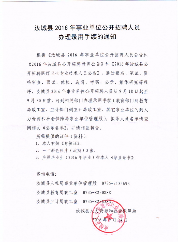 原標題:汝城縣2016年事業(yè)單位公開招聘人員辦理錄用手續(xù)的通知