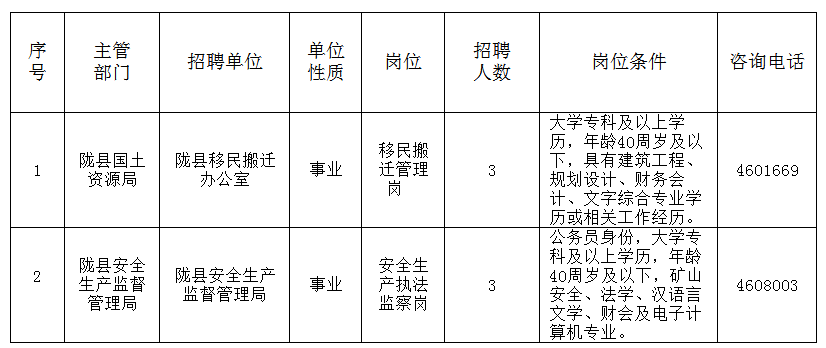二、選調(diào)職位:詳見下表《2016年隴縣國土資源局、安全生產(chǎn)監(jiān)督管理局公開選調(diào)工作人員計劃表》