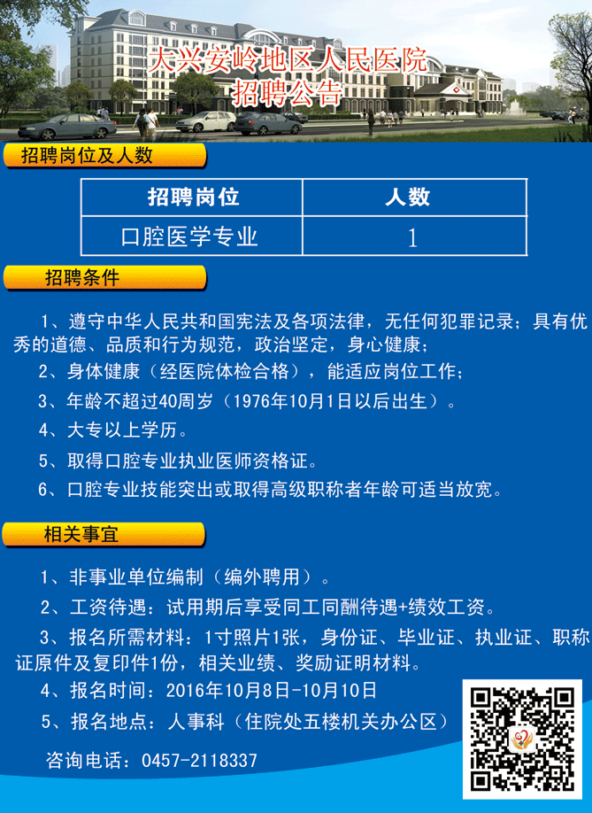2016黑龍江大興安嶺地區(qū)人民醫(yī)院口腔醫(yī)學(xué)專業(yè)招聘公告【招1人】