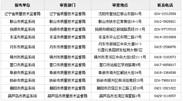 遼寧省質(zhì)監(jiān)系統(tǒng)(除沈陽、大連市)資格審查時間地點安排如下: