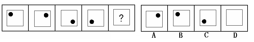 (答案:B。黑點(diǎn)在正方形中順時(shí)針移動。在第5個(gè)圖形中,應(yīng)該正好移動到左上角。)