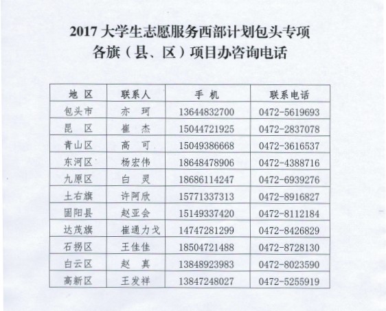 關(guān)于西部計(jì)劃包頭市地方項(xiàng)目報(bào)名,只要符合內(nèi)蒙古大學(xué)生志愿服務(wù)西部計(jì)劃地方項(xiàng)目招募條件(詳見實(shí)施方案預(yù)通知),沒有在大學(xué)生志愿服務(wù)西部計(jì)劃官方網(wǎng)站上報(bào)名或報(bào)名后未通過高校審核的,也可直接致電包頭市各旗縣區(qū)項(xiàng)目辦報(bào)名參加考試。