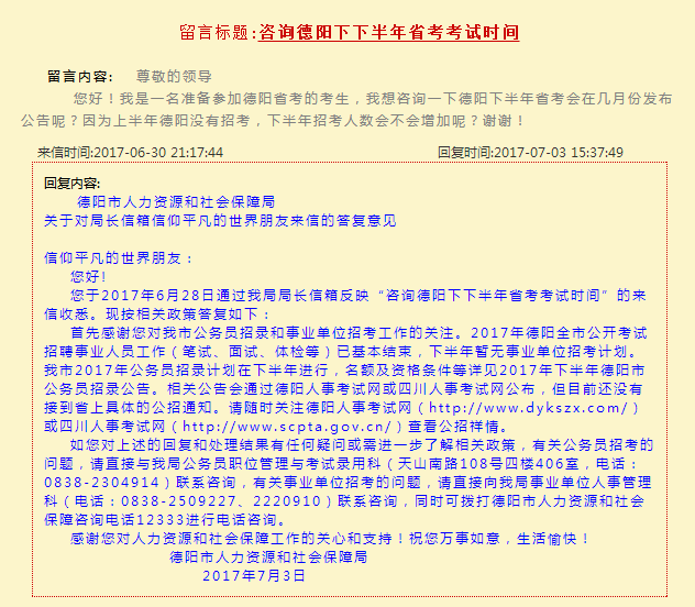 近日,德陽(yáng)局長(zhǎng)信箱回復(fù)德陽(yáng)考生:下半年暫無(wú)事業(yè)單位招考計(jì)劃。我市2017年公務(wù)員招錄計(jì)劃在下半年進(jìn)行。詳情如下: