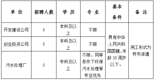 2、試用期滿合格,予以正式轉(zhuǎn)正;試用期滿不合格,予以退回勞務派遣公司。轉(zhuǎn)正后薪酬按照企業(yè)相關(guān)標準執(zhí)行:污水處理廠3000元/月起;開發(fā)建設公司和創(chuàng)業(yè)投資公司3800元/月起。
