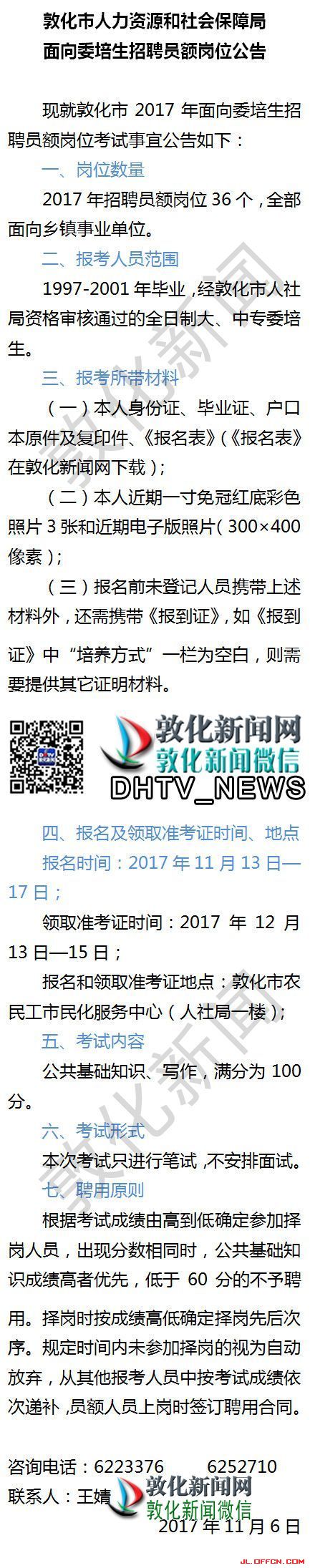 敦化市人力資源和社會(huì)局面向委培生招聘員額崗位公告,現(xiàn)就敦化市2017年面向委培生招聘員額崗位考試事宜公告如下:
