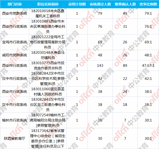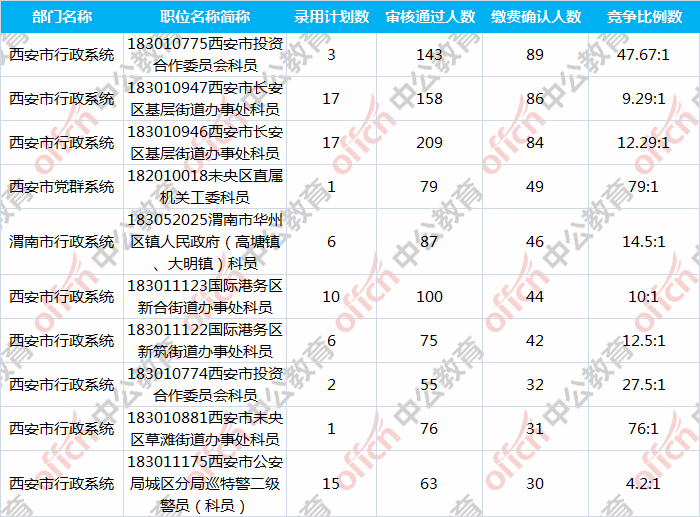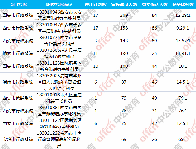 報(bào)名競爭最激烈的前十的職位主要集中在西安市黨群系統(tǒng)、西安市行政系統(tǒng)、寶雞市行政系統(tǒng)等部門,具體信息如下: