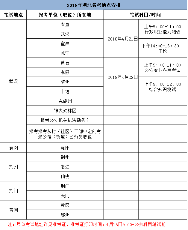 2018年湖北公務員考試考場分布地點已發(fā)布,據(jù)湖北人事考試網(wǎng)通知:2018年湖北省公務員考試筆試在武漢市設置主考區(qū),同時在襄陽市、荊州市、荊門市、黃岡市設置分考區(qū)。具體在各市參加考試的地區(qū)有哪些,請看下表: